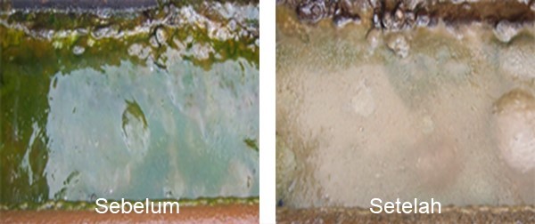 Adanya lumut dalam cooling pond tentu dapat mengganggu proses pendinginan, sehingga harus dikendalikan pertumbuhannya dan dibuang. Berikut ini adalah hasil uji coba chemical biocide EONBAC BC 3220, cairan pembersih lumut dan alga di lapangan cooling pond Pungut GS.