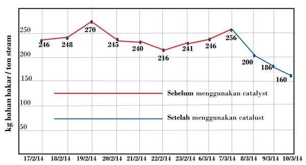 Meski biaya operasional menurun, tapi efisiensi boiler meningkat (lihat grafik di bawah), karena catalyst meningkatkan efisiensi pembakaran dan efisiensi panas seperti telah diterangkan di atas.