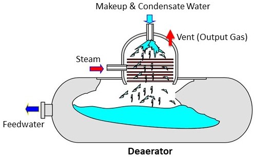 Deaerator dipanasakan dengan menggunakan steam. Selain digunakan untuk menaikkan temperatur, steam juga berfungsi untuk meniup gas-gas yang telah terlepas sehingga gas keluar melalui vent (output gas).