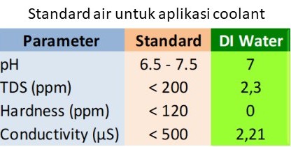 - Keuntungan menggunakan DI Water secara total cost lebih hemat karena membuat pemakaian coolant lebih irit dan sistem lebih aman dari bahaya korosi dan bakteri