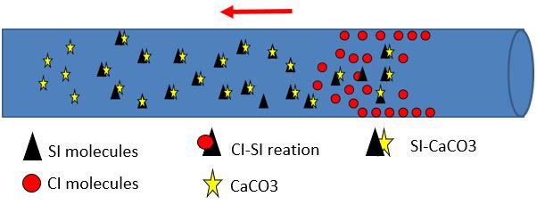 - Scale inhibitor bereaksi secara kimia dengan CaCO3 untuk merusak permukaannya. Kemudian setelah bertemu dengan moleku corrosion inhibitors, scale inhibitor yang telah mengikat CaCO3 tidak bereaksi dengan corrosion inhibitor