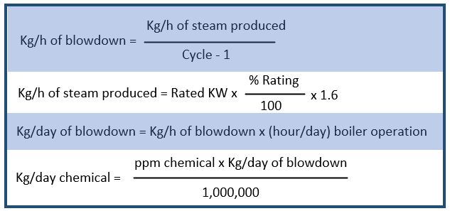 Konsumsi boiler chemicals dihitung dengan mempertimbangkan blowdown. Hal ini karena sebagian chemical akan hilang lewat blowdown, jadi jumlah pemakaian chemical perlu melibatkan faktor blowdown.