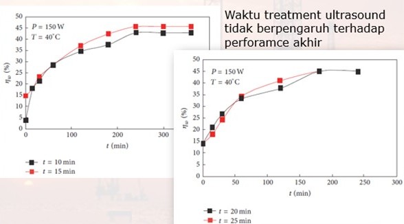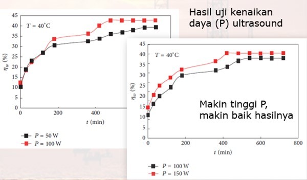 - Dengan menaikkan suhu (T) dan daya ultrasonic (P) performance sonochemistry meningkat