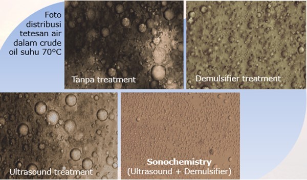 - Dari hasil foto mikroskopik, performance sonochemistry sangat baik untuk demulsifikasi