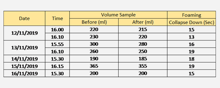 The foaming issue can be resolved with chemical anti-foam agents or defoamers, which function to break down already formed foam. The working principle of defoamers is to replace the surfactant on the foam surface formed between the dissolved gas and the liquid, causing the gas to be released from the foam and the foaming liquid to merge with other liquids. When the gas is released from the liquid phase, foaming no longer occurs.