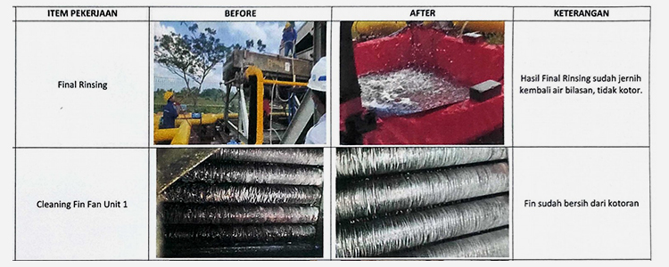 Eonchemicals memberikan solusi dengan 2 produk EonFin 410 dan EonFin 280. Setelah dilakukan proses cleaning dengan produk tersebut, fungsi fin fan cooler kembali normal.