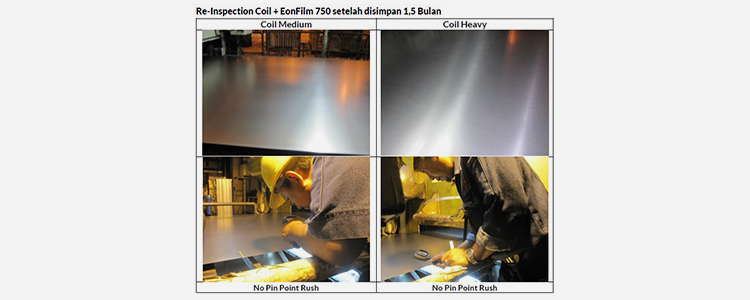 Memenuhi kebutuhan industri steel, Eonchemicals menghadirkan produk RPO khusus, yaitu EonFilm 750. Produk yang kuat untuk melindungi steel coil dari korosi hingga 12 bulan, tapi mudah dibersihkan ketika coil akan diproses lebih lanjut.