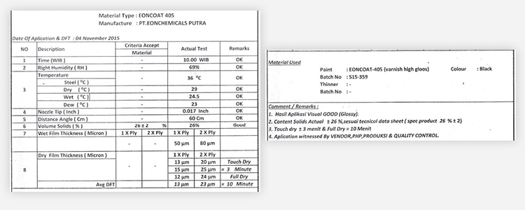 Berikut ini adalah data coating inspection setelah 6 bulan menggunakan EonCoat, yang dinyatakan berhasil (OK Accepted) karena memenuhi harapan customer.