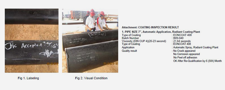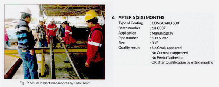 Berikuti ini adalah hasil inspeksi EonCoat 408 dan EonGuard 500 setelah aplikasi 6 bulan. Coating mampu mencegah terjadinya korosi pada permukaan pipa OCTG, mencegah crack dan peel off sehingga lapisan coating tetap menempel kuat di badan pipa selama penyimpanan lebih dari 6 bulan.