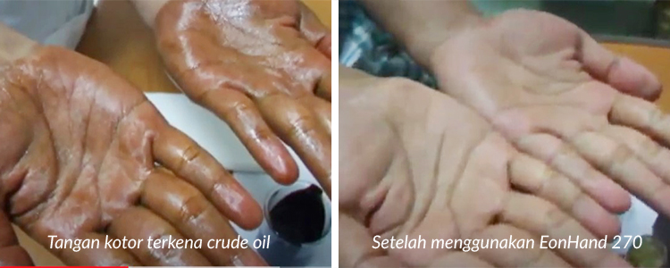 Untuk mengatasi masalah tangan kotor karena crude oil atau grease yang sering dialami para pekerja migas, Eonchemicals memberikan solusi dengan produk EonHand 270 yang memiliki fitur dan benefit sebagai berikut: