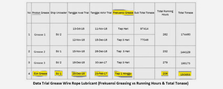 Dengan NLGI 000 EonWire 230 memberikan perlindungan maksimal pada wire rope baik sebagai pelumas dan juga sebagai anti karat. Berikut ini adalah data hasil trial perbandingan beberapa grease dengan Eonwire 230.